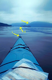 So if you are paddling your kayak in a straight line towards a point, your bow and that point will line up. So lets say you are paddling your kayak to the tip of an island. You have a clear point you are paddling too. But lets say behind that island there is a mountain. and the summit - or in the case of the photo where the mountain meets the sea - there will be another point. So now you have three points you are keeping track of 1- your bow. 2 - the tip of the island, and 3- where the mountain touches the sea. All three are lined up. 1,2,3. But as you keep paddling, you realize point 3 - where the mountain meets the sea - starts to drift to the right, while your bow is still pointed at the tip of the island, this means your kayak is drifting to the right. Likewise if the mountain moves left while your bow is still pointed at the island, you are drifting left.