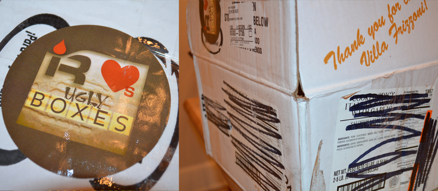 Sure enough, they like keeping things out of landfill. On the left is a sticker on the box that says IR 'hearts' ugly boxes. On the right is the box. Reused many times. I don't know where Villa Frizzoni is, but now I want Italian food.