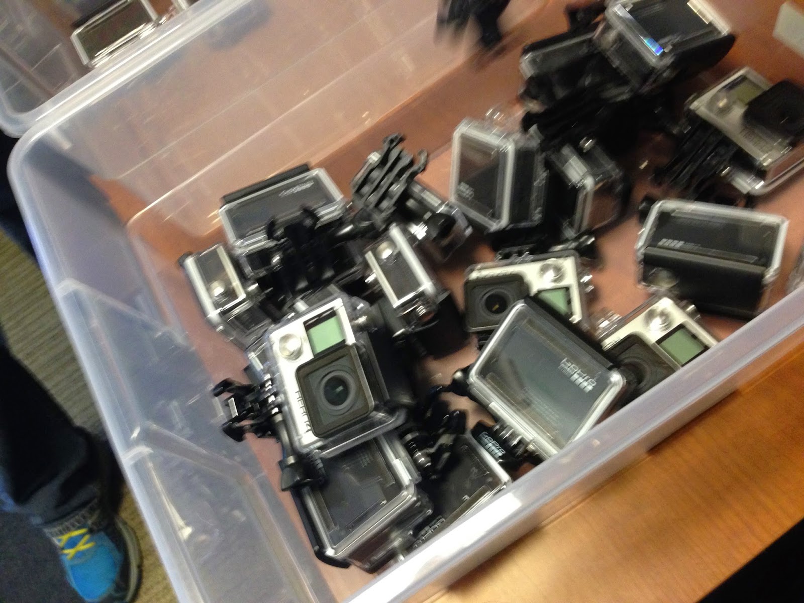 After signing in (and signing a non-disclosure agreement I can't tell you about the Hero 6+ I saw... kidding!) we got started training on the Hero 4's. We spent a fair amount of time going over the training materials we will use to train our staff, learning a ton of details about the cameras, After that it was time to head outside to play. But first we needed cameras.
